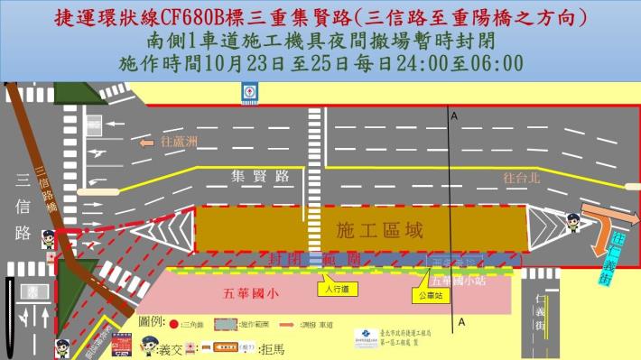 施工單位將自114年10月23日至10月25日(每日夜間24:00至翌日06:00)開始進行三重區集賢路 (三信路至仁義街間)車站區南側1車道暫時封閉作業,施工範圍如附圖。 施工作業期間請用路人行經施工區域減速慢行,並依改道後之宣導牌面、遵循導引標誌及現場指揮人員導引指示減速慢行,以確保行車安全。施 ...更多