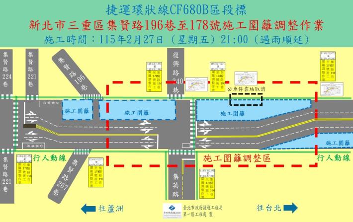 施工單位將自115年2月27日(五)夜間21時起,進行中央避車線(三重區集賢路196巷至178號)施工圍籬調整及五華街口站(往蘆洲)公車停靠站取消作業,遇雨順延或擇日再施工,施工範圍如附圖。 施工作業期間請用路人行經施工區域減速慢行,並依改道後之宣導牌面、遵循導引標誌及現場指揮人員導引指示減速慢 ...更多