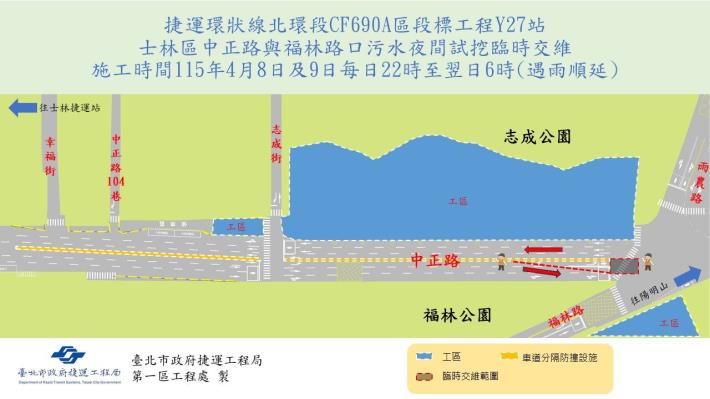 為配合捷運環狀線北環段CF690A區段標工程Y27站污水試挖,捷運工程局第一區工程處將於115年4月8日及9日每日22時至翌日6時,進行中正路與福林路口(往故宮方向)臨時圍設作業,遇雨順延或改期,相關施工範圍如附圖所示。 本次施工將於士林區中正路與福林路口(往故宮方向)內側圍設2車道,屆時施工圍設起 ...更多