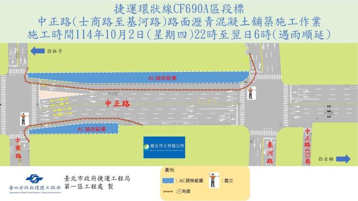 環狀線北環段CF690A標工程為配合Y25站擴大交維計畫,臺北市政府捷運局第一區工程處將於114年10月2日夜間22時起進行臺北市士林區中正路(士商路至基河路路段)路面瀝青混凝土舖築作業,遇雨順延,施工範圍如附圖。 施工期間請用路人配合改道通行,並遵循導引標誌及現場指揮人員指示減速慢行,民 ...更多