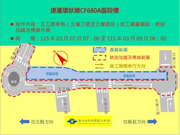為辦理捷運環狀線北環段CF680A區段標工程施工,臺北市政府捷運局第一區工程處將於115年3月7日上午7點起至115年3月9日早上6點止,於五工路東側(五權三路至五權路段)進行施工圍籬圍設、交通動線調整、道路刨鋪及標線劃設工程(詳附圖)。 本工程施工期間請用路人配合改道通行,並遵循導引標誌及現場指揮 ...更多