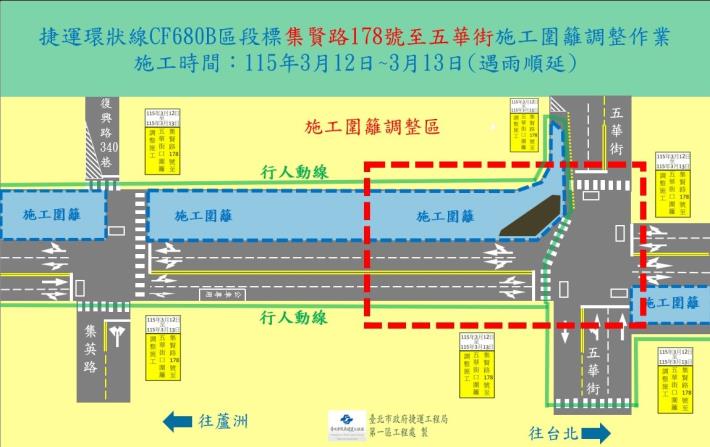為配合捷運環狀線北環段CF690A區段標工程Y27站污水試挖,捷運工程局第一區工程處將於115年3月19日及20日每日22時至翌日6時,進行中正路與福林路口(往故宮方向)臨時圍設作業,遇雨順延或改期,相關施工範圍如附圖所示。 本次施工將於士林區中正路與福林路口(往故宮方向)內側圍設2車道,屆時施工圍 ...更多