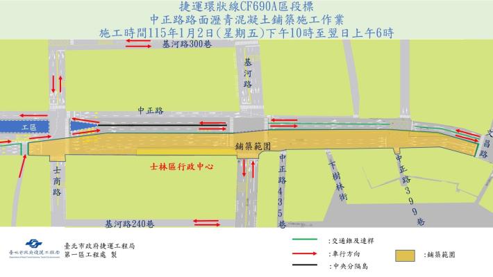 環狀線北環段CF690A區段標工程為配合Y25站擴大交維計畫,臺北市政府捷運工程局第一區工程處將115年1月2日22時至1月4日6時進行臺北市士林區中正路(士商路至文昌路段)路面瀝青混凝土舖築作業,遇雨順延,施工範圍如附圖。 為維持車輛通行,本次瀝青混凝土舖築採半半施工及對向調撥車道,期程規劃說明如 ...更多